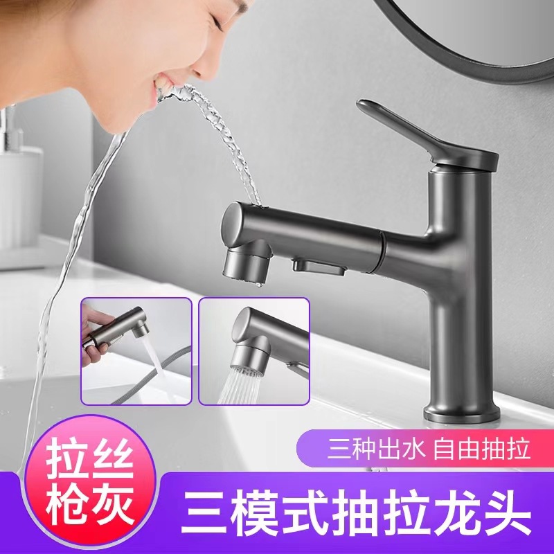 Ambil keran pull-out abu-abu panas dan dingin, kamar mandi rumah tangga, keran tembaga meja cuci tangan, keran teleskopik saluran air ganda