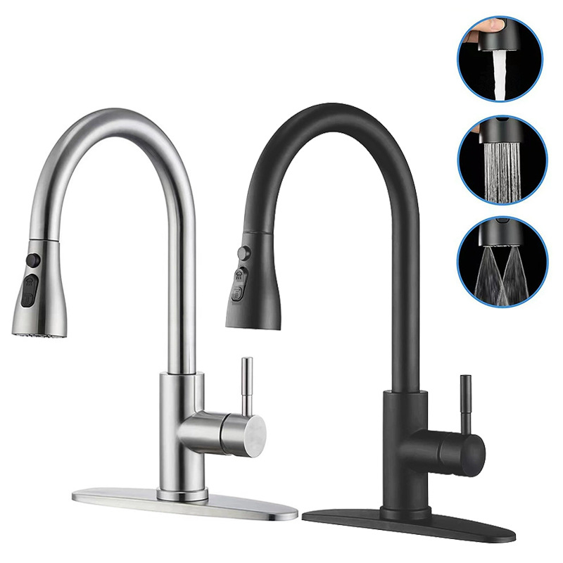 304 keran air panas dan dingin wastafel dapur, keran air tahan cipratan yang dapat ditarik bahan baja tahan karat