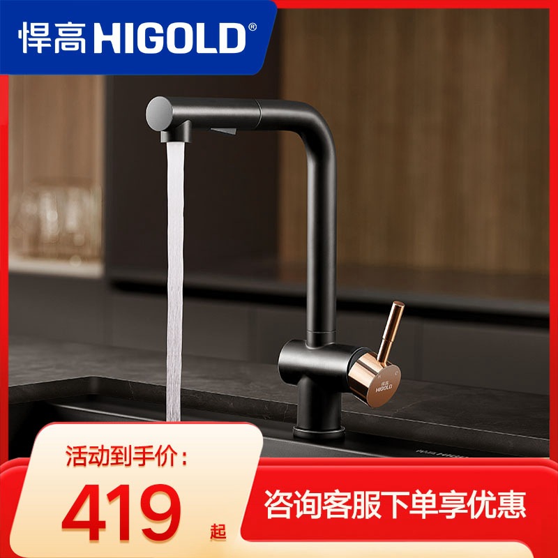 Huigao keran wastafel dapur, keran wastafel ditarik 7 kata hitam stainless steel 304 panas dan dingin berputar