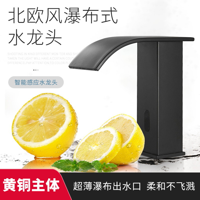 Keran induksi pintar air terjun Nordic, keran induksi pintar hitam otomatis, konter induksi dingin tunggal, wastafel panas dan dingin