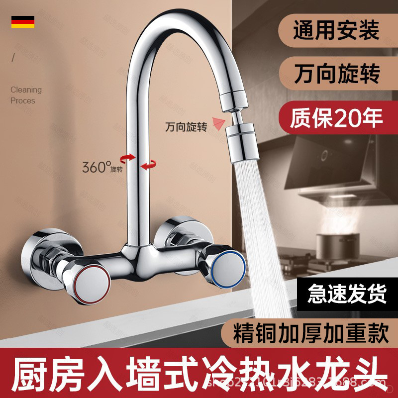 Katup pencampur lubang ganda panas dan dingin, keran dapur tembaga pasang dinding panas dan dingin, wastafel rumah tangga, baskom sayuran, balkon, katup pencampur