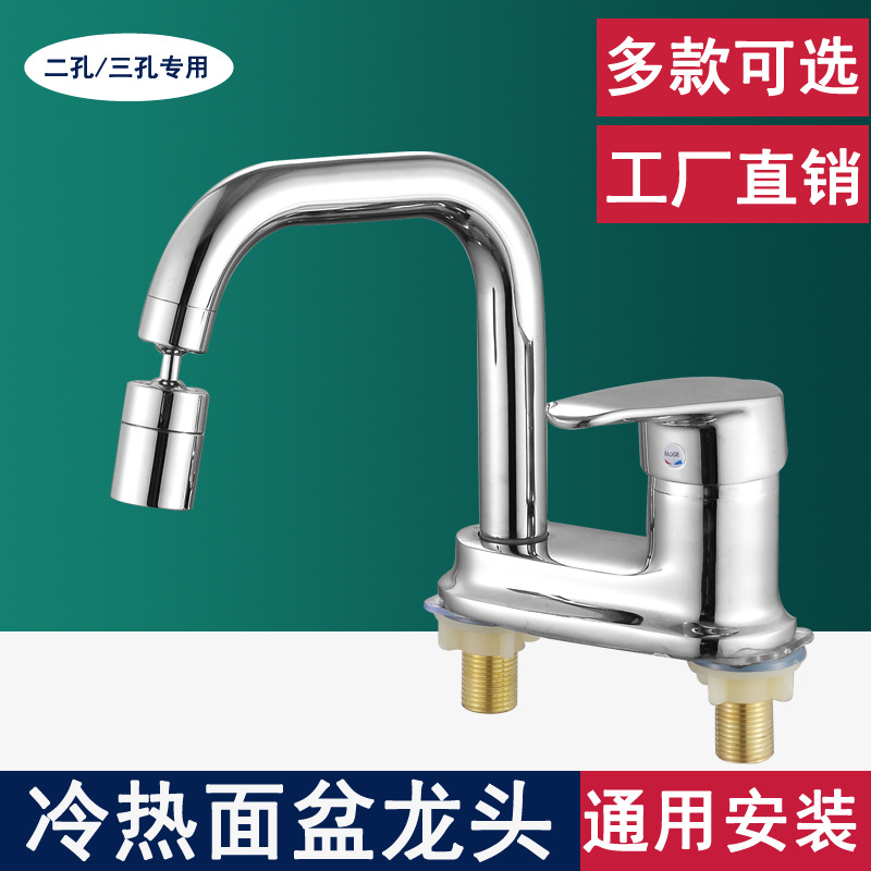 Keran wastafel tembaga lubang ganda, keran kamar mandi panas dan dingin berputar, keran dua mode, wastafel tembaga tiga lubang