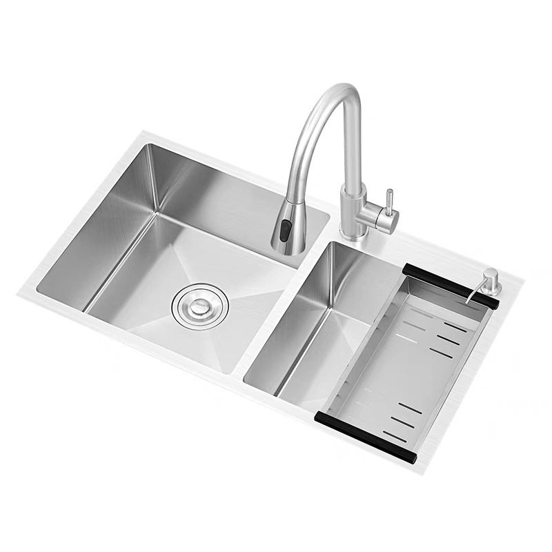 不锈钢拉丝双槽双盆厨房水槽洗碗池洗菜盆不锈钢304抽拉龙头水槽