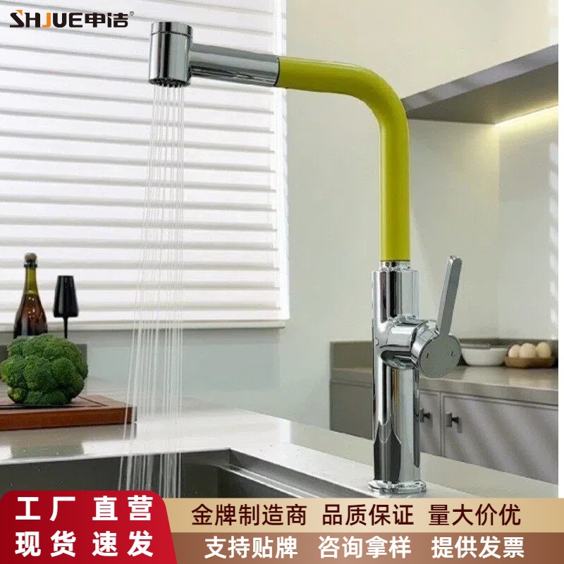 Wastafel tembaga tarik keluar keran panas dan dingin, keran rumah tangga lubang tunggal dapat diputar, pendek dapat ditarik