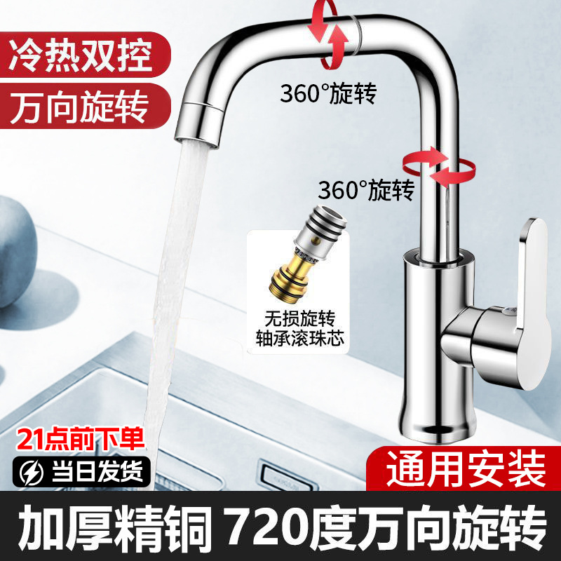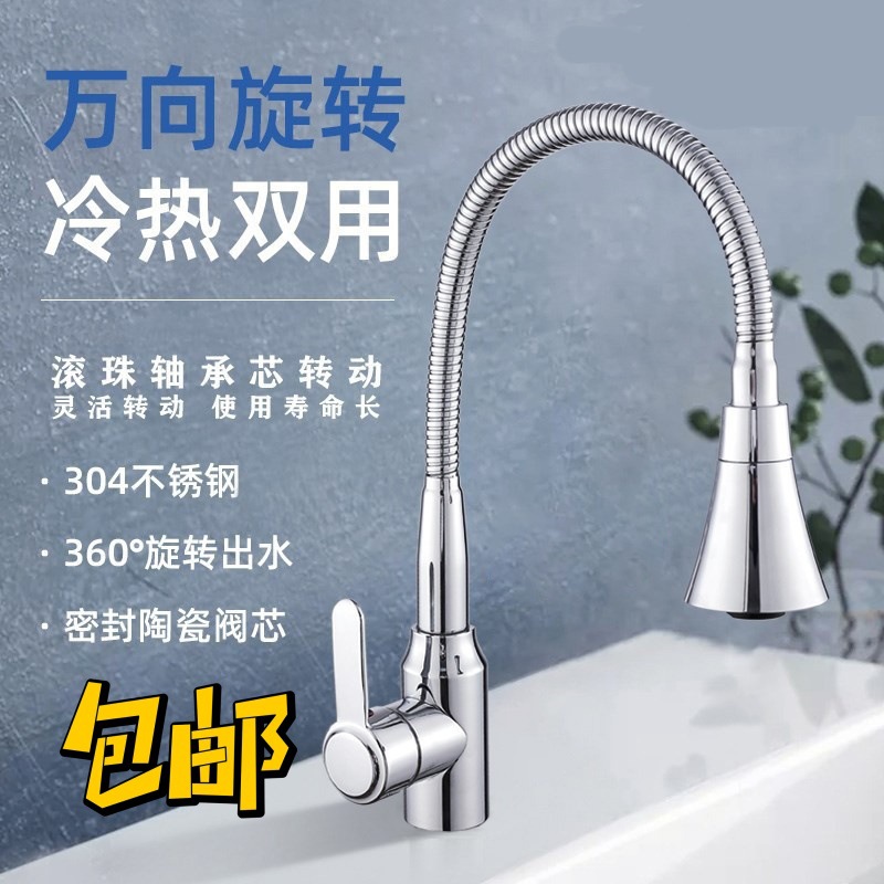 Keran dapur stainless steel, keran dapur rumah tangga stainless steel, bak sayur panas dan dingin, tahan percikan, bantalan bola universal, berputar