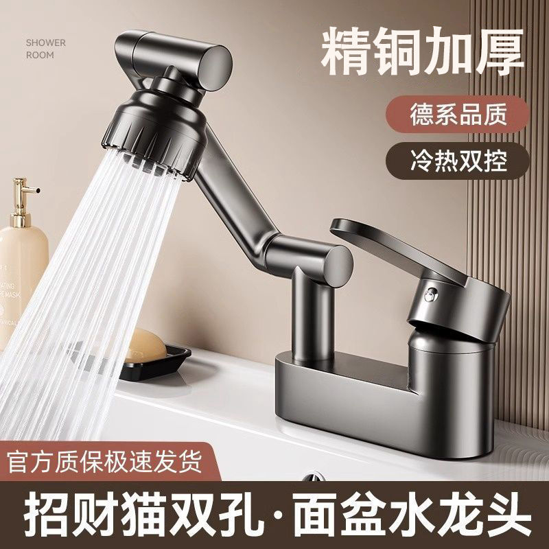 Keran wastafel lengan mekanis baja tahan karat, keran bak abu-abu kucing keberuntungan universal berputar keran panas dan dingin multifungsi