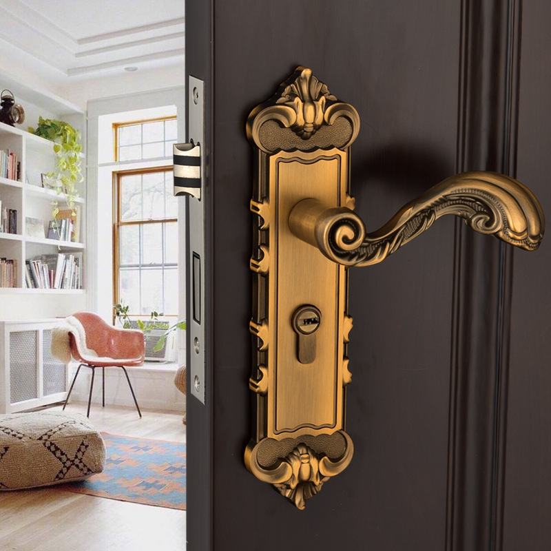 Kunci pintu dalam ruangan gaya Eropa, kunci pegangan senyap perunggu kuning, kunci pintu kayu solid, kunci pintu rumah tangga grosir