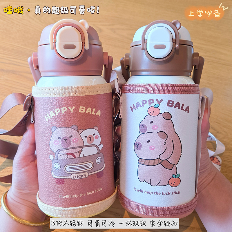 手拎式带杯套便携学生背带水壶一盖双饮带锁扣上学卡通提手保温杯
