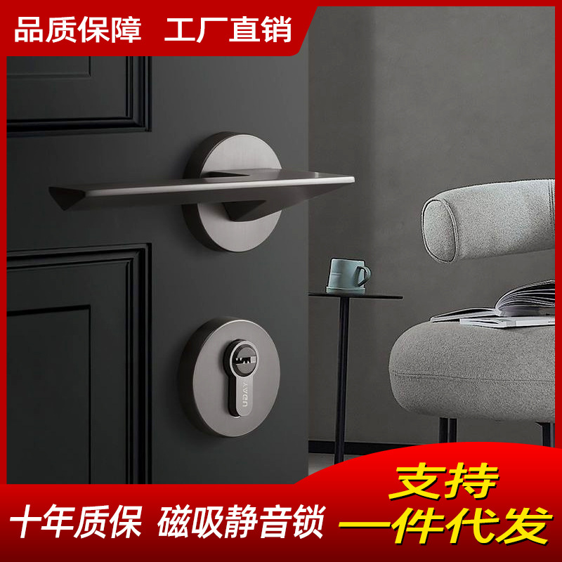 Kunci pintu magnetik terpisah, gaya Nordic, interior kamar tidur, bisu post-modern sederhana solid kayu kunci pintu abu-abu hitam set lengkap