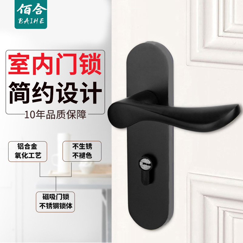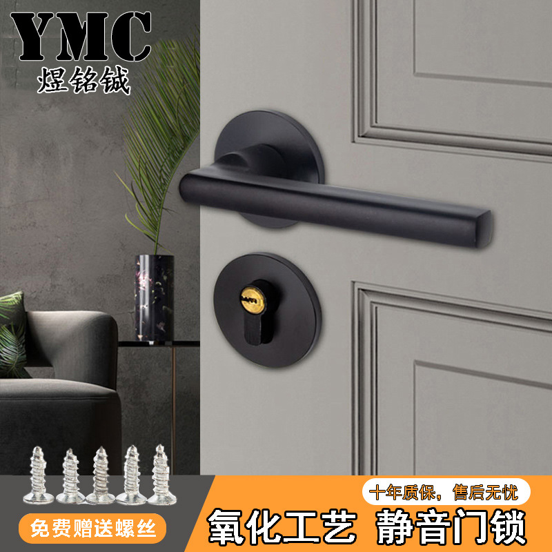 Kunci pintu kamar tidur, kunci pintu kamar tidur senyap, hitam sederhana zinc alloy dalam ruangan magnetik universal pegangan tiga tiang, kunci pintu kamar