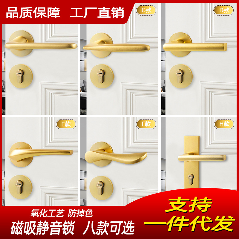 Kunci pintu emas terang, setelan indoor kamar tidur, kunci pintu split, kunci mewah disikat, Bisu, sederhana, engsel kunci pintu magnetik