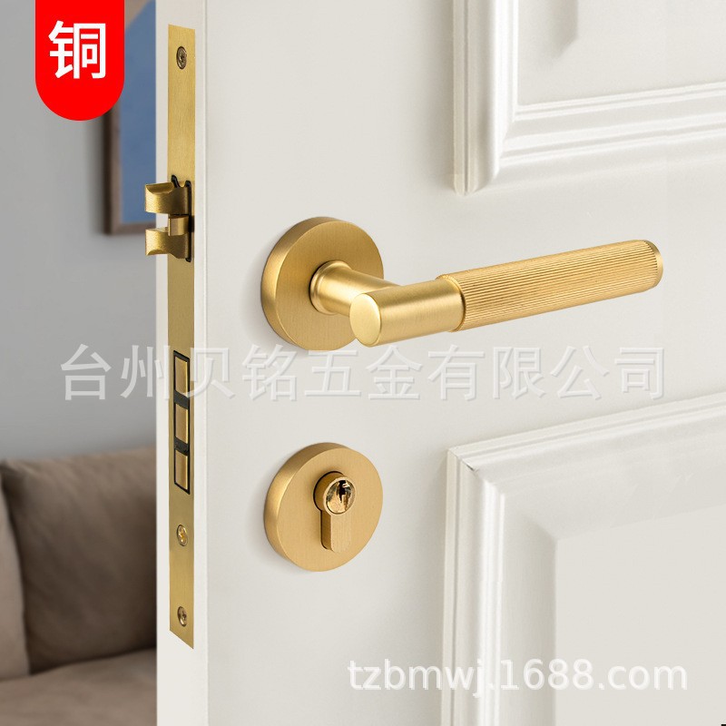 Kunci pintu kuningan gaya Nordic, kunci pintu dalam ruangan kamar tidur senyap magnetik modern sederhana kunci pintu kayu solid emas perak