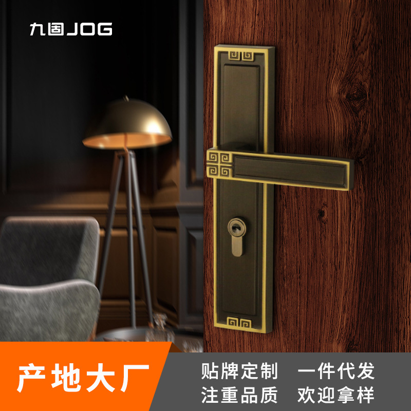 Jiugu kunci pintu kayu padat gaya Tiongkok, gagang pintu dalam ruangan retro kamar tidur gaya Eropa tidak bersuara pegangan sederhana