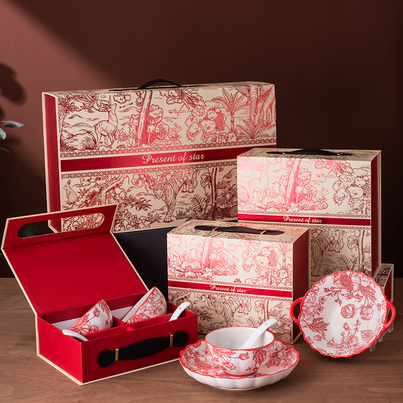 Golden edge kotak hadiah mangkok keramik peralatan makan setelan pembukaan aktivitas hadiah keramik mangkuk piring setelan set mangkuk grosir