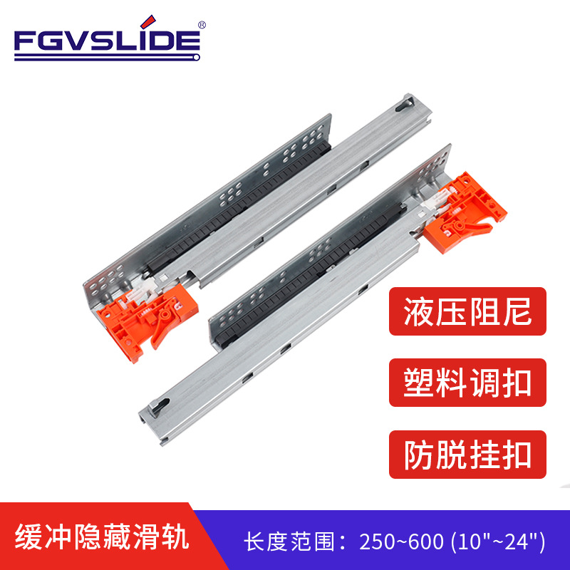 Dongyue rel geser tersembunyi penyangga tiga bagian, rel tersembunyi plastik gesper dapat diatur favorit rel tersembunyi dengan anti-mati gesper gantung laci