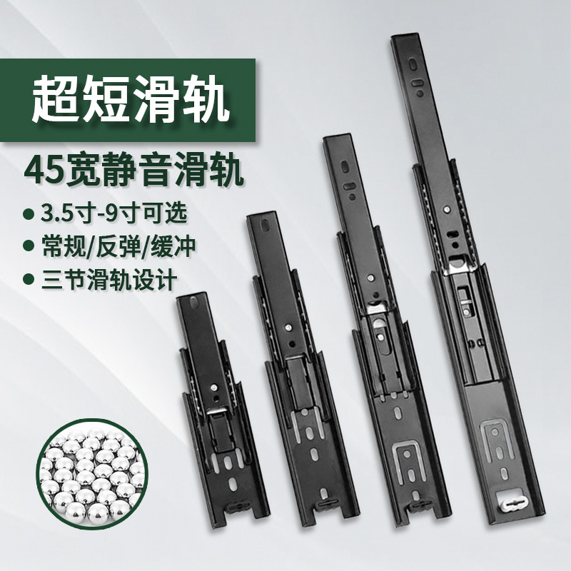 Rel geser ultra-pendek 45 lebar 3,5 inci 4 inci 6 inci 8 inci 9 inci mini tiga bagian penyangga rel rebound