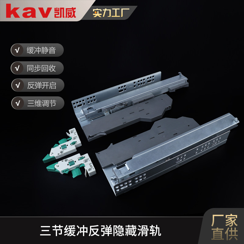 Tiga bagian penyangga rebound bawah tersembunyi rel geser self-priming self-elastic handle-free laci panduan peredam