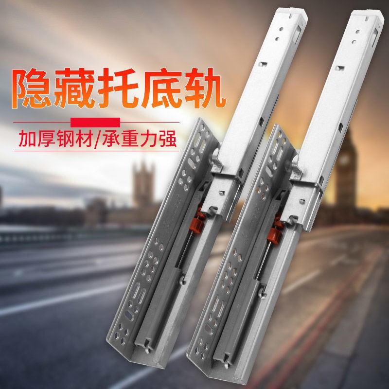 Tiga bagian rel geser tersembunyi penyangga senyap kabinet tebal rel panduan tiga lipatan bawah mendukung peredam jalur rel geser