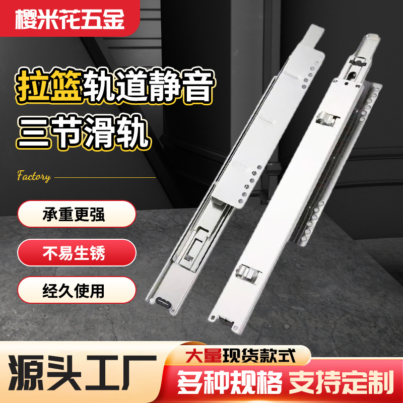 [Aksesoris perangkat keras] rel geser laci bola baja rel geser tiga bagian penyangga penutup sendiri rel peredam tarik penuh