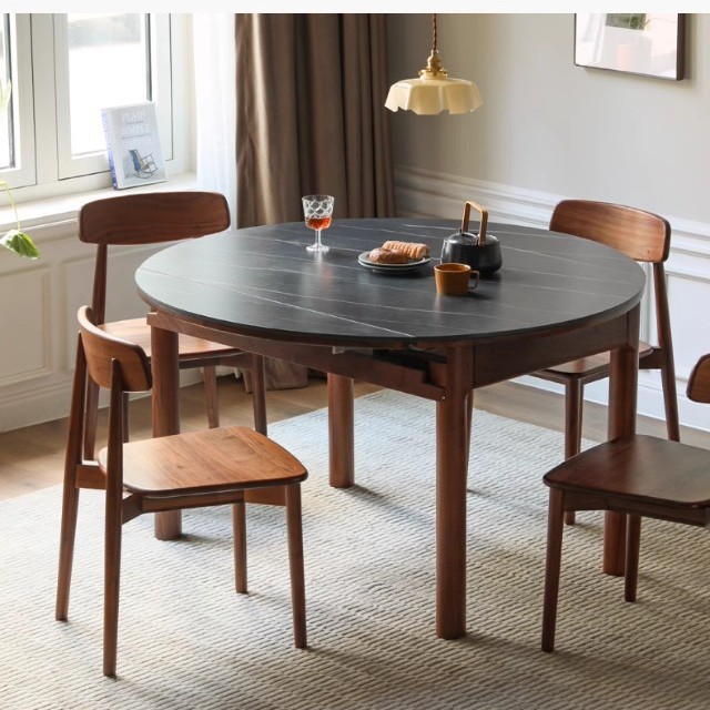 Meja Makan Papan Batu Kayu Solid Seluruh Rumah Tangga Meja Makan Lipat Tipe Kecil Kayu Kenari Hitam Meja Bulat Teleskopik Sederhana
