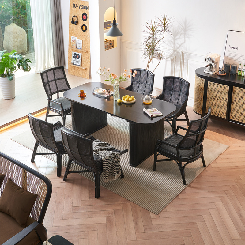 Meja makan kayu Nordic, kayu solid modern minimalis hitam meja panjang dan kursi kombinasi rumah apartemen kecil hotel restoran meja makan