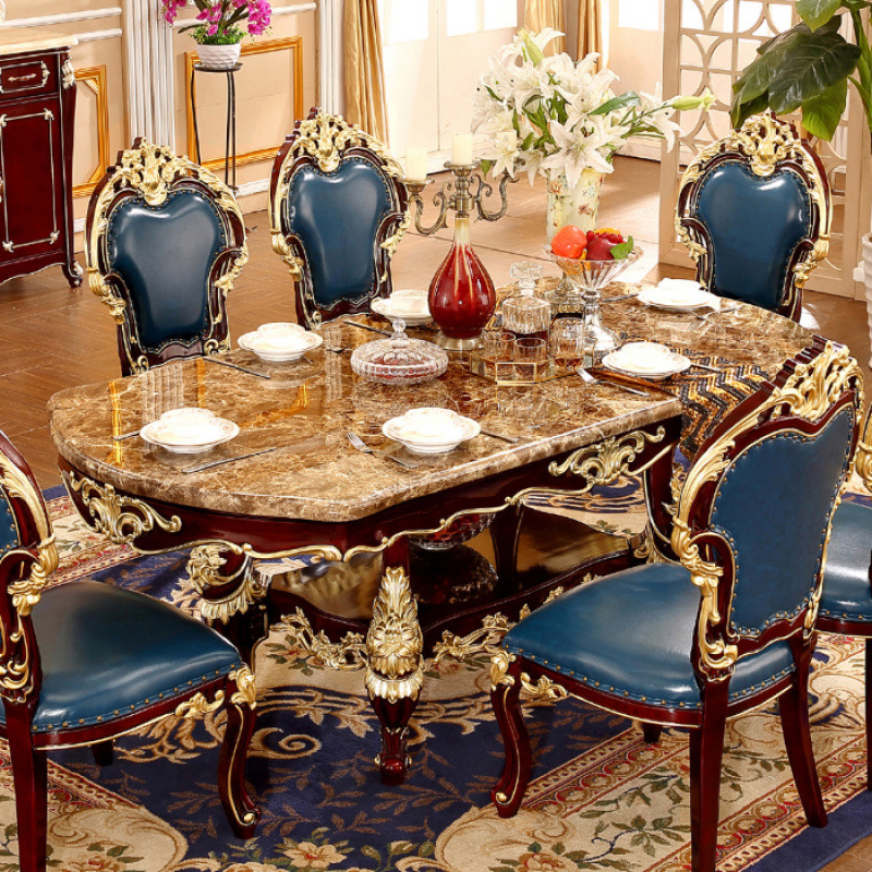Meja Makan Panjang 2,0 Meter Warna Kayu Merah Kayu Solid Penuh Permukaan Marmer Meja Makan Oval Kursi Meja Makan Kombinasi Gaya Eropa