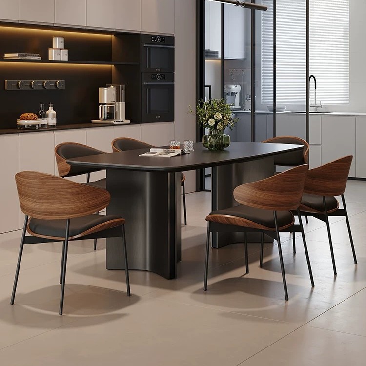 Pabrik Penjualan Langsung Bingkai Logam Desain Kayu Imitasi Arc Sandaran Gaya Italia Mewah Ringan Sederhana Ruang Makan Kursi Makan Sandaran Ruang Tamu