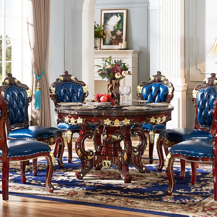 Meja Makan marmer gaya Eropa dan kombinasi kursi baru klasik merah cendana semua kayu padat diukir dengan meja putar kecil apartemen rumah meja bulat