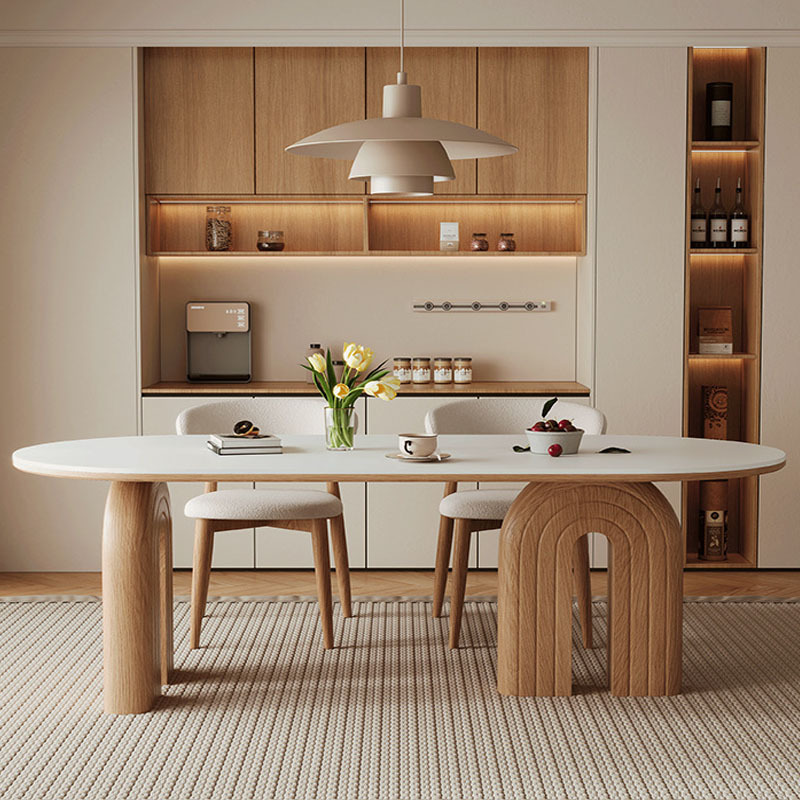 Gaya Perancis Krim Kayu Solid Papan Batu Meja Makan Kursi Gaya Pertengahan Tipe Unit Kecil Arc de Triomphe Oval Meja Makan Kursi Kombinasi