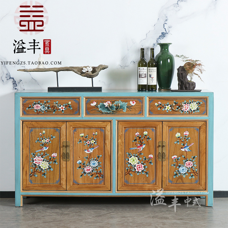 Kabinet teh elm gaya Tiongkok, lemari penyimpanan pintu masuk ruang tamu, lemari anggur sisi kayu solid multifungsi untuk rumah tangga