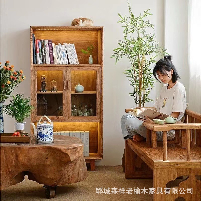 Elm kabinet kaca kayu padat antik, Kabinet papan samping kabinet tampilan log rak buku lemari anggur B & B furnitur ruang tamu
