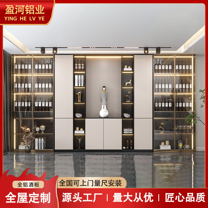 Kabinet tampilan rumah minimalis Modern, lampu mewah restoran pintu kaca datar dengan lampu dinding penuh kustomisasi kabinet anggur semua aluminium