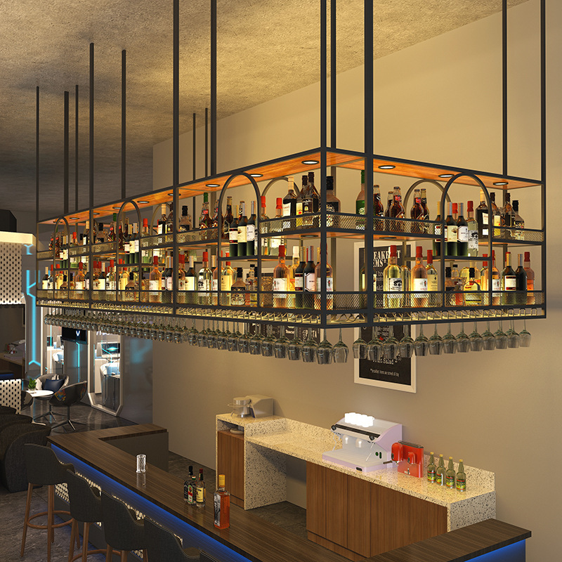 Rak Bar anggur gantung gaya industri, rak penyimpanan kabinet anggur besi bar restoran komersial rak kaca anggur terbalik