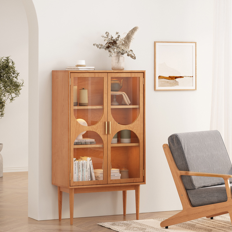 Lemari buku kayu padat Nordic, modern minimalis penyimpanan rumah tahan debu kaca pintu kabinet lampu mewah lemari anggur tampilan dinding kabinet