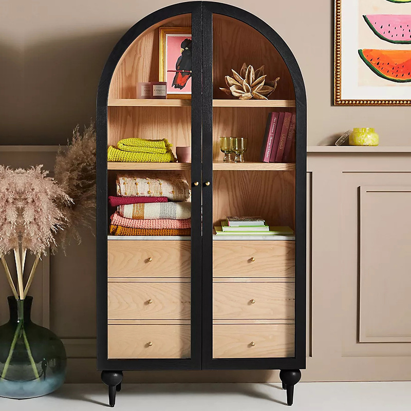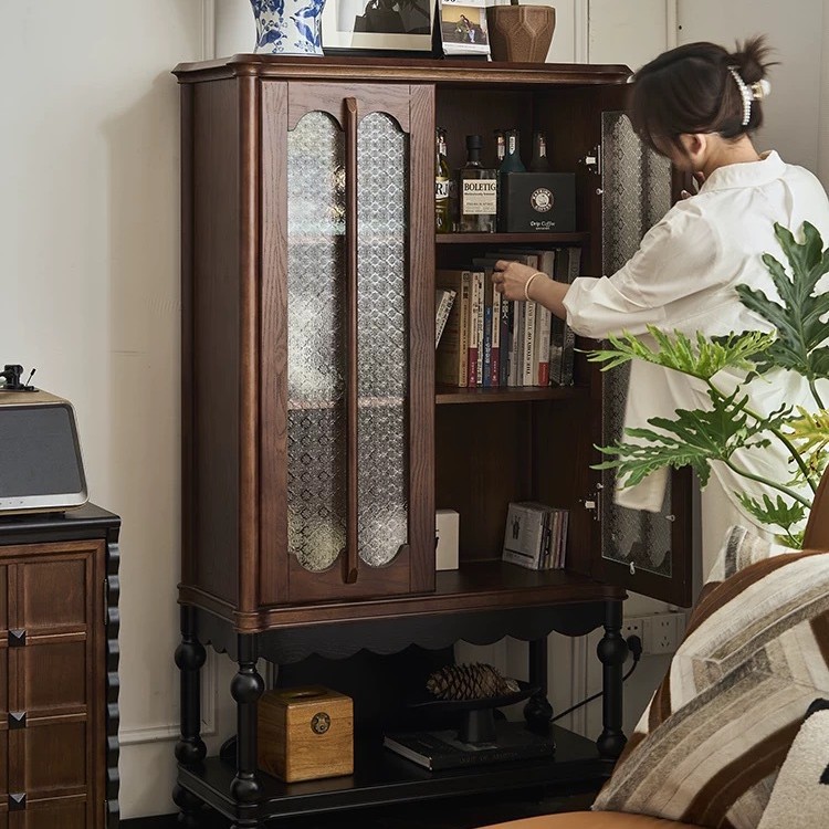 Kabinet anggur lengkungan kayu padat gaya Amerika kabinet samping retro Prancis kabinet kaca Nordik kabinet penyimpanan rak buku pintu ganda modern sederhana