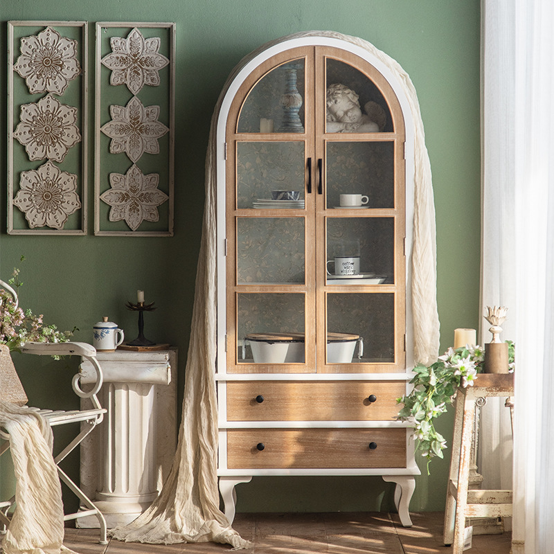 Rak buku gaya Perancis papan samping lengkungan putih kabinet pajangan kaca lemari anggur ruang tamu pintu ganda laci kayu solid furnitur antik