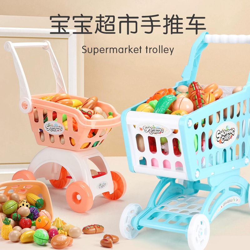 Mainan keranjang belanja supermarket anak-anak, troli bayi laki-laki dan perempuan rumah-rumahan memotong buah memotong kue