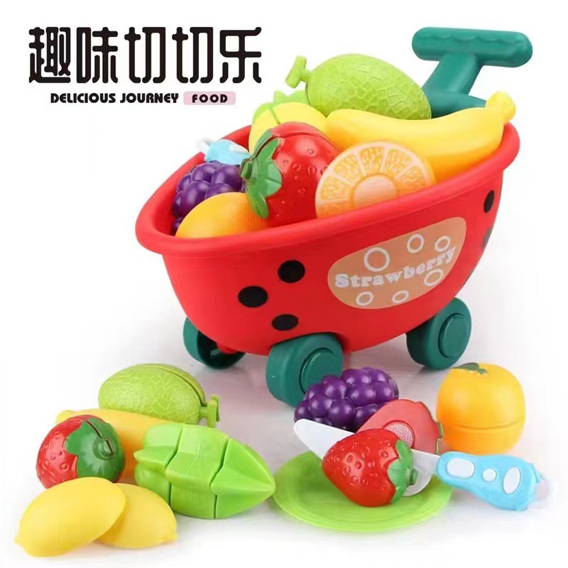 Mainan anak-anak bermain rumah dapur pemotong buah setelan bayi troli kecil stroberi buah memotong musik anak laki-laki dan perempuan