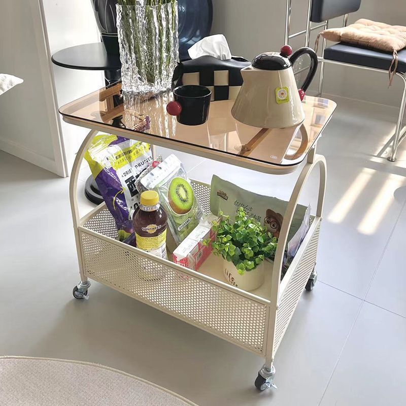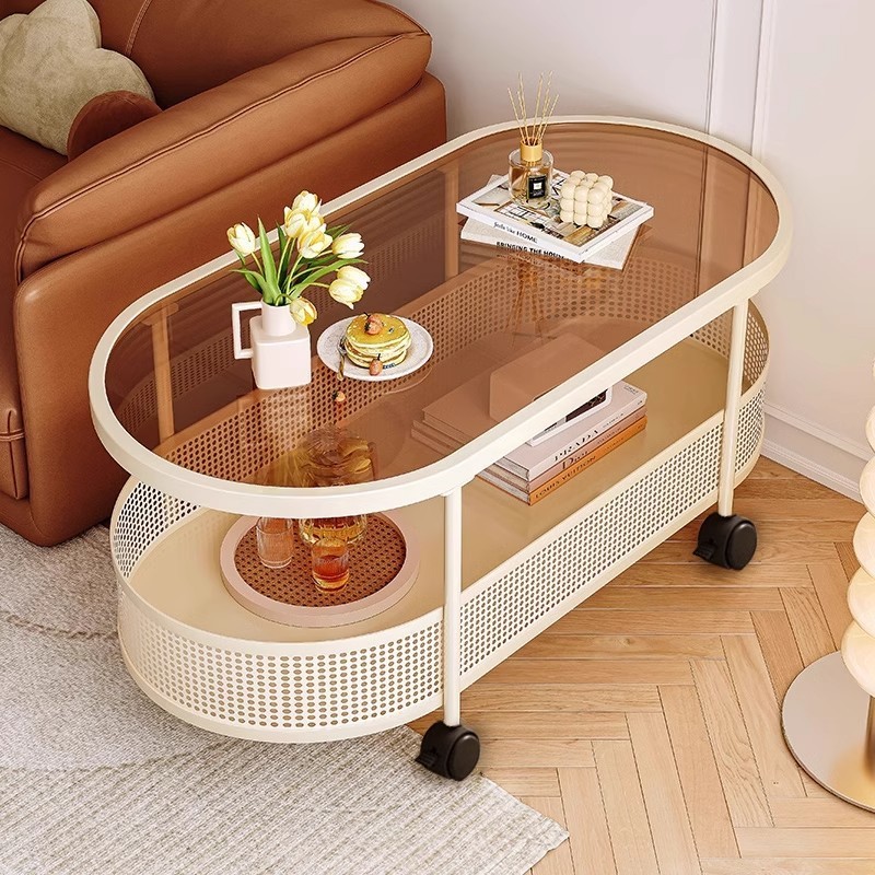 Meja Kopi Kecil yang Dapat Didigeser Ruang Tamu Roda Sabuk Krim Meja Rumah Tangga Meja Sofa Kaca Sudut Meja Samping Lemari Troli Kecil Sederhana
