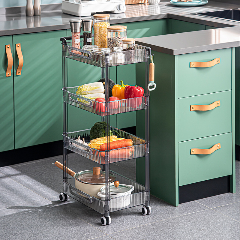 Rak penyimpan data, dapur kamar mandi multi-lapis ruang tamu kamar tidur rak penyimpanan makanan ringan portabel dengan roda transparan plastik troli rumah tangga