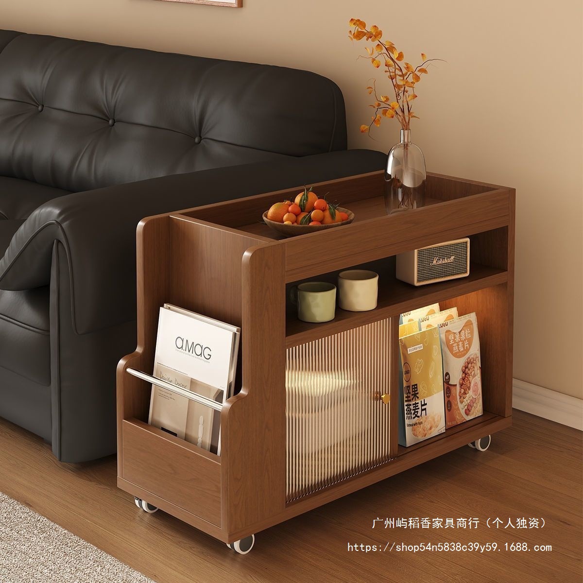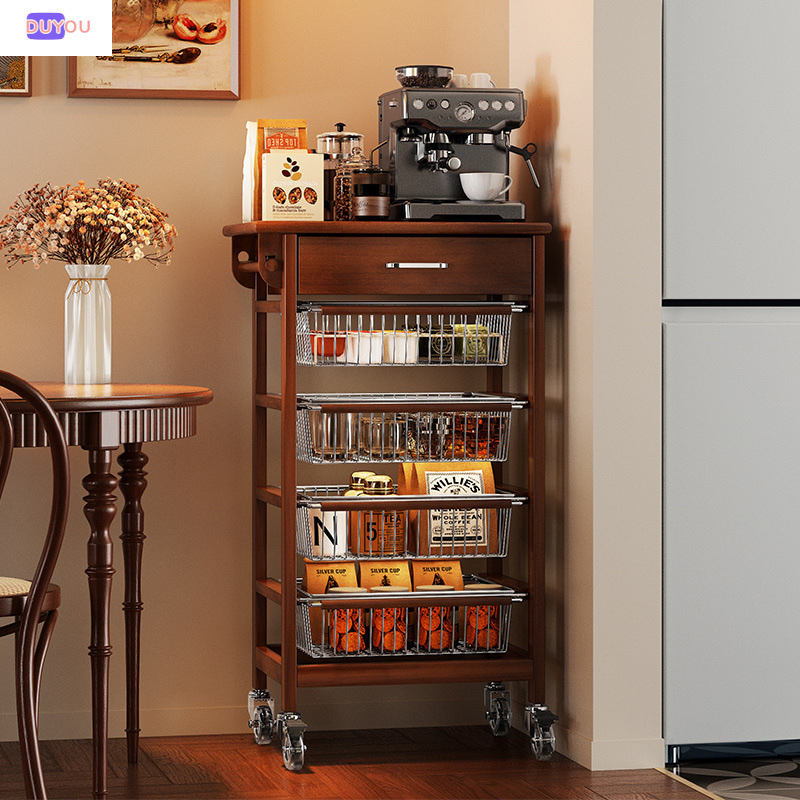 Rak Troli Kayu Solid Gaya Pertengahan Rak Penyimpanan Lantai di Ruang Tamu Kamar Tidur Penyimpanan Minuman Makanan Ringan Gaya Reproduksi