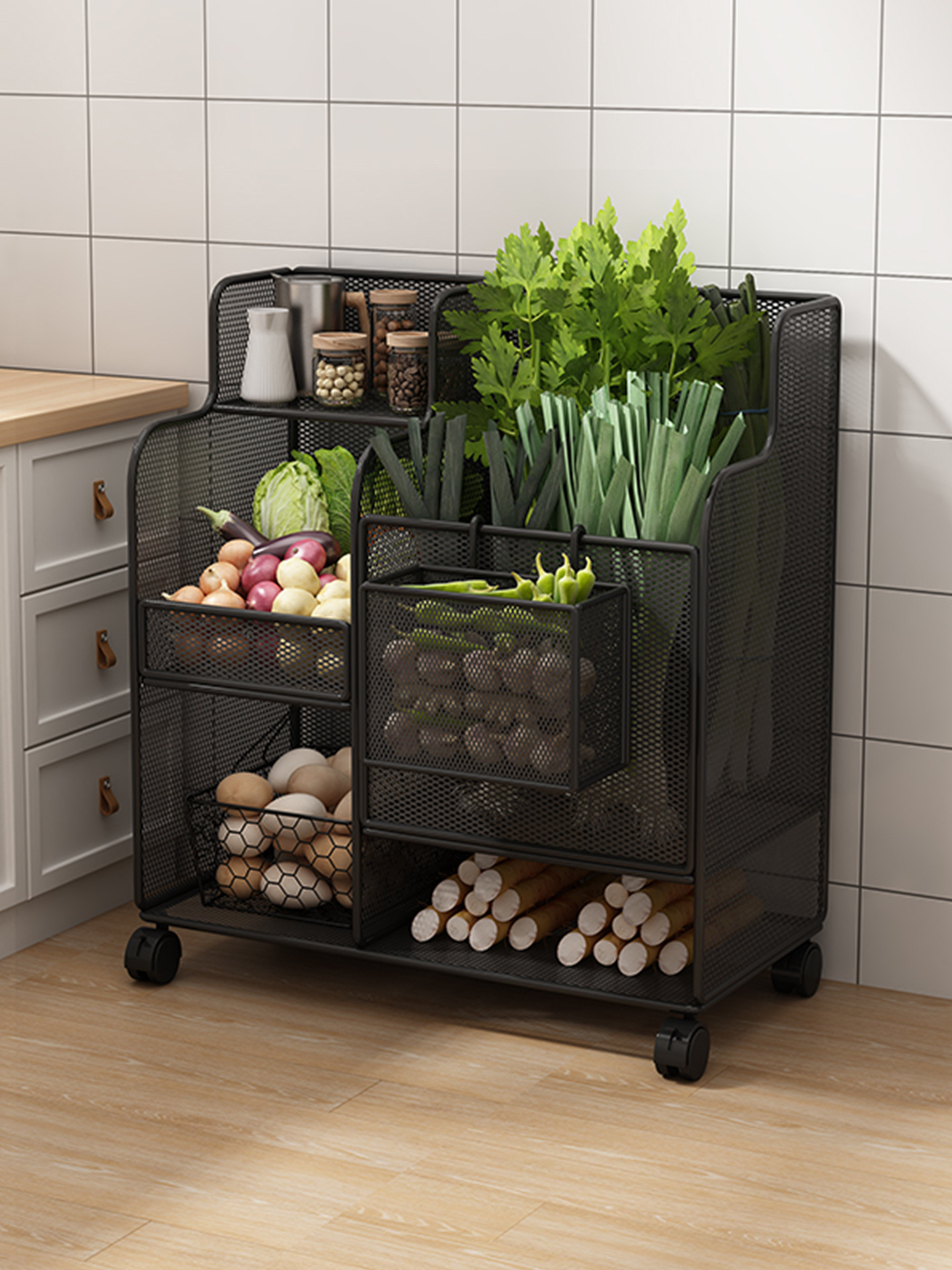 Beroda Troli Kecil Rak Penyimpanan Sayuran Rak Dapur Lantai Bertingkat Rak Penyimpanan Keranjang Sayuran Makanan Ringan Rumah Tangga