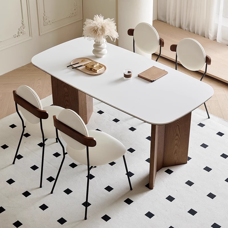 Meja makan dan kursi kombinasi, piring batu kayu padat gaya retro Prancis, modern sederhana, warna kenari persegi panjang, meja makan apartemen kecil