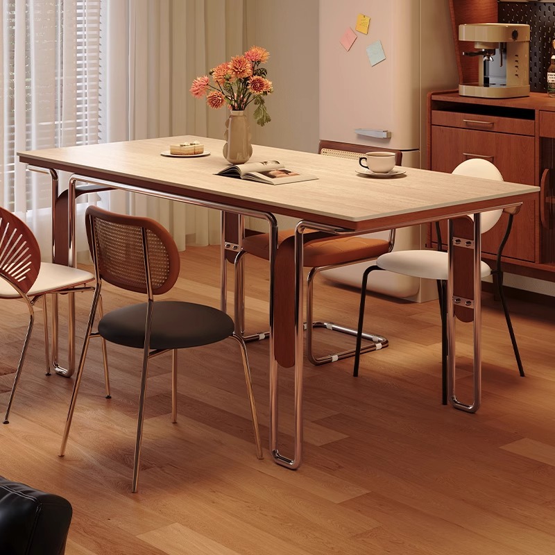 Meja Makan Kayu Solid Papan Batu Batu Gaya Pertengahan Meja Makan Persegi Panjang Eropa Utara Stainless Steel Bauhaus Perabotan Retro Meja Makan