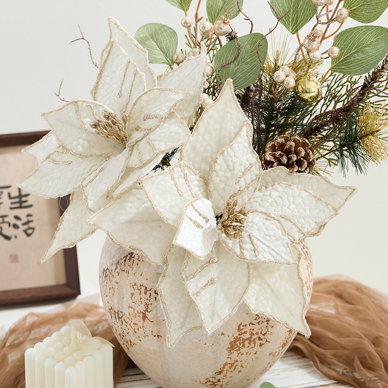Bunga Natal bunga buatan kepala pohon Natal, bunga Natal kepala bunga merah muda, aksesori buah emas, dekorasi rumah karangan bunga liburan