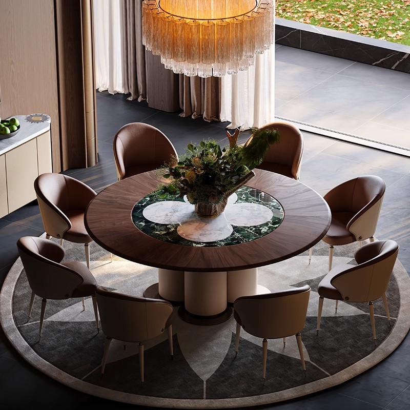 Meja Makan Bulat Marmer Alami Gaya Italia Villa Lantai Datar Besar Restoran Desain Rumah Tangga Meja Makan Walnut dengan Meja Berputar