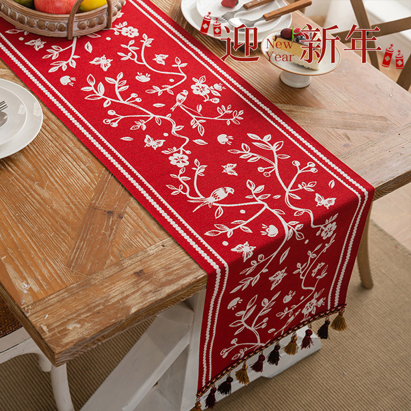 跨境亚马逊棉麻手工流苏桌旗餐桌布艺加厚圣诞绿松喜庆装饰品