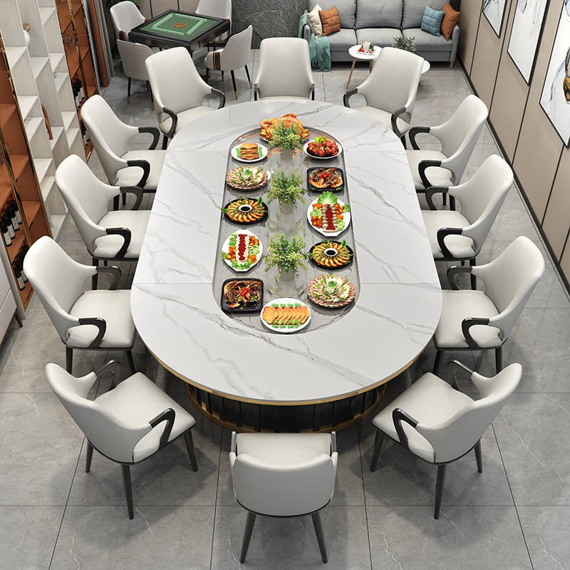 Meja Makan Listrik Papan Batu Oval Gaya Tiongkok Baru 18 Orang 20 Orang Meja Hot Pot Meja Putar Persegi Panjang Kayu Solid Gaya Tiongkok Baru