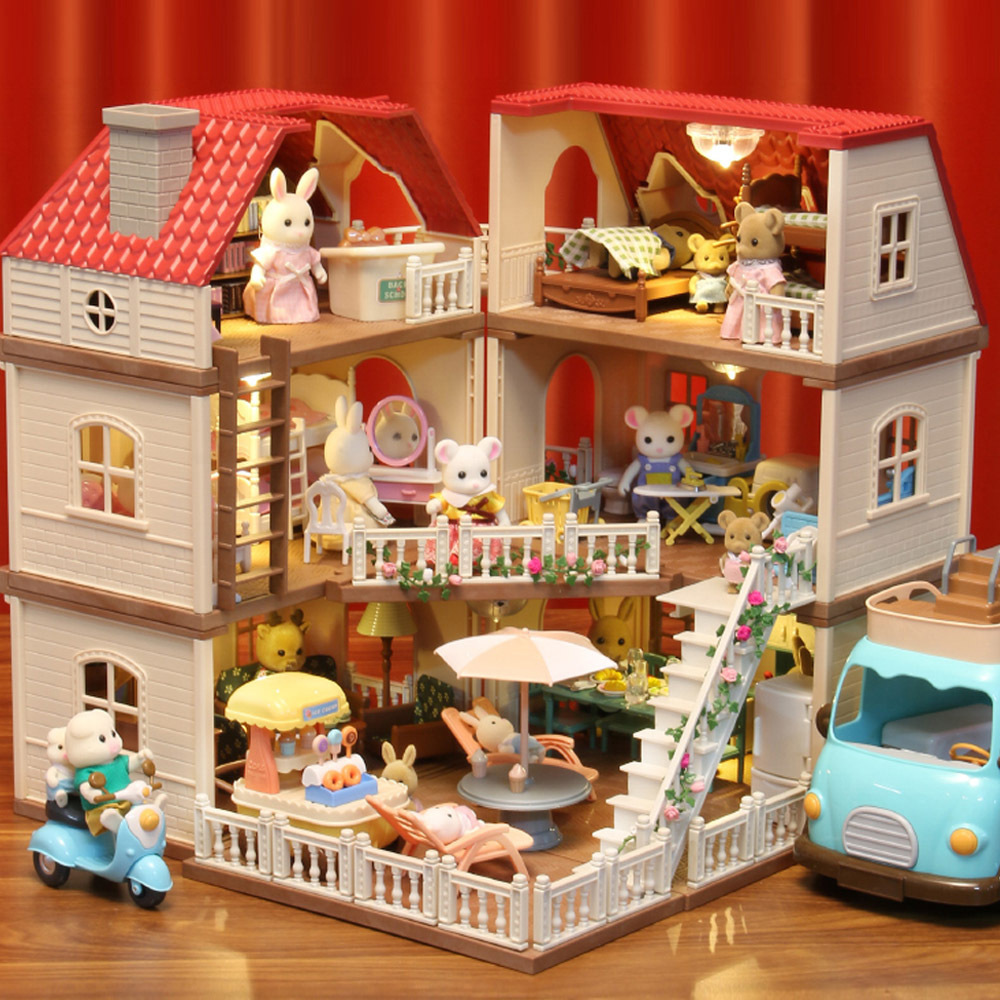 Bermain lintas batas rumah miniatur aksesoris adegan mainan hutan villa pencahayaan keluarga rumah besar hadiah gadis kecil