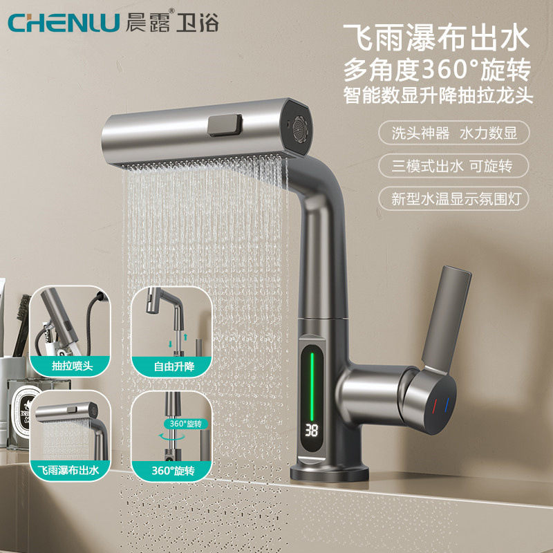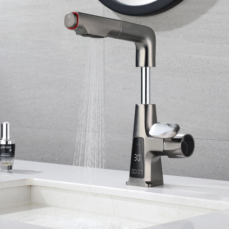 Keran wastafel, rumah tangga modern sederhana berputar pull-out tampilan digital panas dan dingin keran hujan terbang